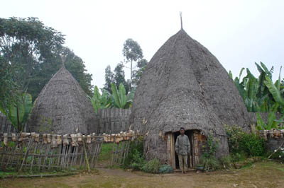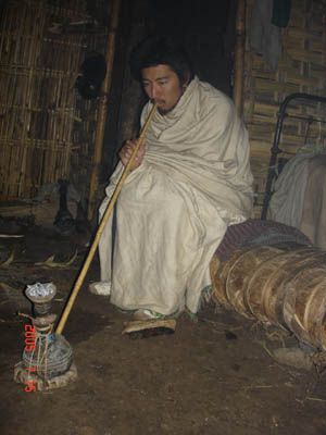 コンソの村は集会場を中心として同心円上になっており、このような通路で何重かに囲まれています。四方に見張り小屋があることから、砦のような役割だったようです。各住居間も柵で仕切られており、エチオピアにしては随分プライバシーのある暮らしをしています。産箪に入った「出来立て熱々」のビールをいただきました。確かにビールの味はしましたが、やっぱ、できたら冷たい方が、旨いです。