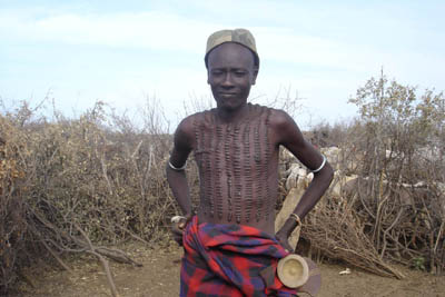 ハマル族の村へ。トゥルミの街で会った、ちょっと英語の話せるディレマという青年に案内してもらい彼の実家へ行きます。「近いぞ」と聞いたが、案の定片道2時間半ほどかかりました。