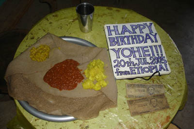 ジンカ の 食堂。最も安価な食事、ベイアハットです。インジェラ(テフという穀物で作った少し酸っぱくて空気の入ったクレープのほうなもの)の上に野菜と豆のソースがのって、手でくちゃくちゃ食べるのです。とても苦手な旅行者もいるのですが、私は幸い好きでした。2ブル(約24円)。東京だと中目黒のエチオピア料理屋さんで食べられます。