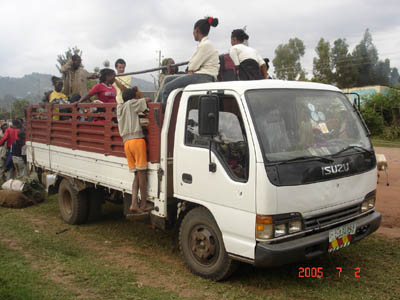 公共交通機関はない所なので、このようにトラックの荷台で移動します。大きな町で市が立つ日に合わせて物を売りに、また は必要な物資を買いに、など理由はいくつかあると思うのですが、とにかく定期とも不定期ともつかずこのようなトラックが来て荷物、ヤギ、ニワトリ、ヒトをごちゃごちゃに乗せて行くのです。「もう無理、積めないって!」「いやいや、まだ乗るでしょ!」と軽く口論になるまで積まないと出発しないので、やたら時間かかります。積んだ荷物の上に乗っかって、穴だらけの土の道を、アクセル全踏みで行くので、暗くなってくると、なかなか怖いです。また、ヤギがぼとぼと糞をするので、そちらも地味に怖いのです。エチオピア人の男性はヘリに腰掛けてる人が多く、「よくあれで落ちないなあ」と思っていたのですが、一人カーブで落ちました。やっぱり。