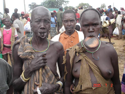 土曜市のムルシ族。とても有名な下唇を切ってお皿をはめている部族です。耳たぶにも小さなお皿をはめています。唇にお皿は女性だけで、右は奥さん、左は姑さんです。姑さんは唇が伸びきってしまい、もはや引退です。旦那さんはマネージャーのように、「お前、写真撮りたいか!?撮りたいだろ!?な!?金払え!」と主に交渉を担当します