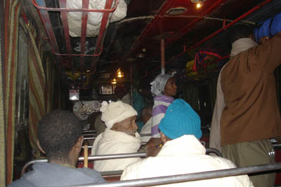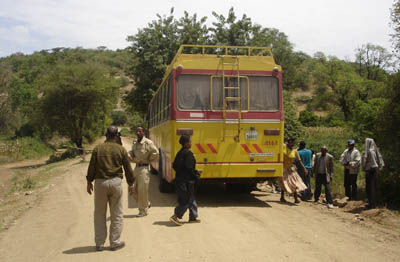 エチオピアは高度があるため、そんなに暑くは無いのですが、それでも人の熱気もあって内部は結構暑いです。しかしエチオピア人は窓を開けません。開けるとすぐ無言で閉められます。後で聞いたところによると悪霊が入ってくるとか、ウイルスみたいのが入ってくるのだとか、まあはっきりとわかりませんでしたが、とにかく窓を開けるのは完全NGなのです。その上、悪路のためあちこちで吐いてる人がいました。私も1out。そんなこともあろうかと皆にビニール袋が配られており、終わった後は袋ごと窓から放り投げます。
