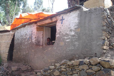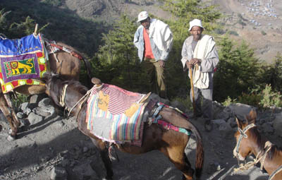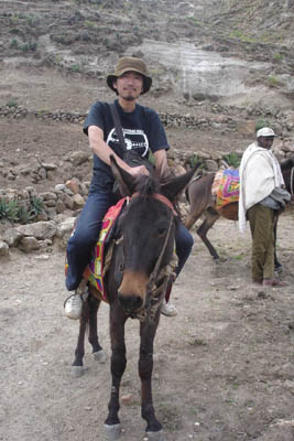 ラバに乗る。ラバ(mule:雄ロバと雌馬の雑種)は険しい山道の荷運びに欠かせません。山の上の教会へ行くのに乗ってみました。急勾配を行くのは面白いですが、歩いたほうが、たぶん楽です。
