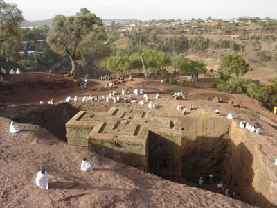 聖ギオルギス教会。岩窟教会。全て「岩山を削る」ことのみで造られています。日曜日なのでミサが行われています。引き算のみで成立している建築。荘厳です。この教会の周囲には横穴が掘られており、修道士たちが住んでいました。ここで寿命を迎えることは最上の幸せとされていたそうです。