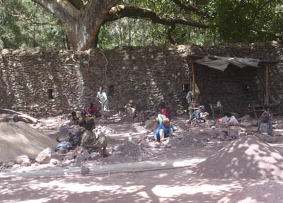 ファシリデス王のプール。街の入口付近にあります。一部修復中の工事現場です。木漏れ日の中、和気藹々と作業してらっしゃいます。