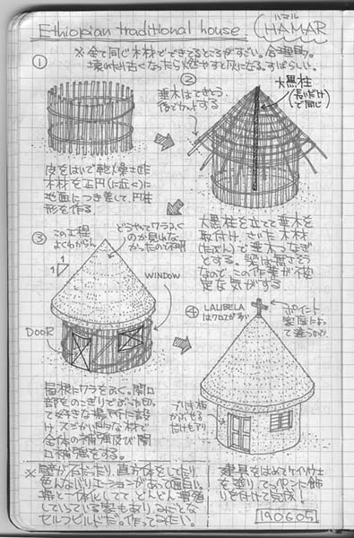 なんてかわいい家ですか。竹の骨組みをバナナの茎と葉で覆って作ります。家のまわりの大きい緑の葉が全部バナナです。真のエコ住宅とはこういうモノですね。その場にあるものを素直に使う。…確認申請下りないでしょうが。