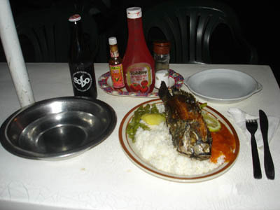 ご飯の上に魚の丸揚げ、トマトソース。美味しかったです。