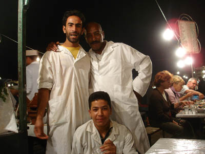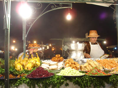 マラケシュDjemaa el-Fna広場。夜飯を食べに、宿から歩いて3分のフナ広場へ。溢れんばかりの電球の光に煙、けたたましい笛の音、太鼓の音、その後ろに浮かぶモスク。一気に引き込まれるアラブの世界。クスクスチキンを食べて一息。