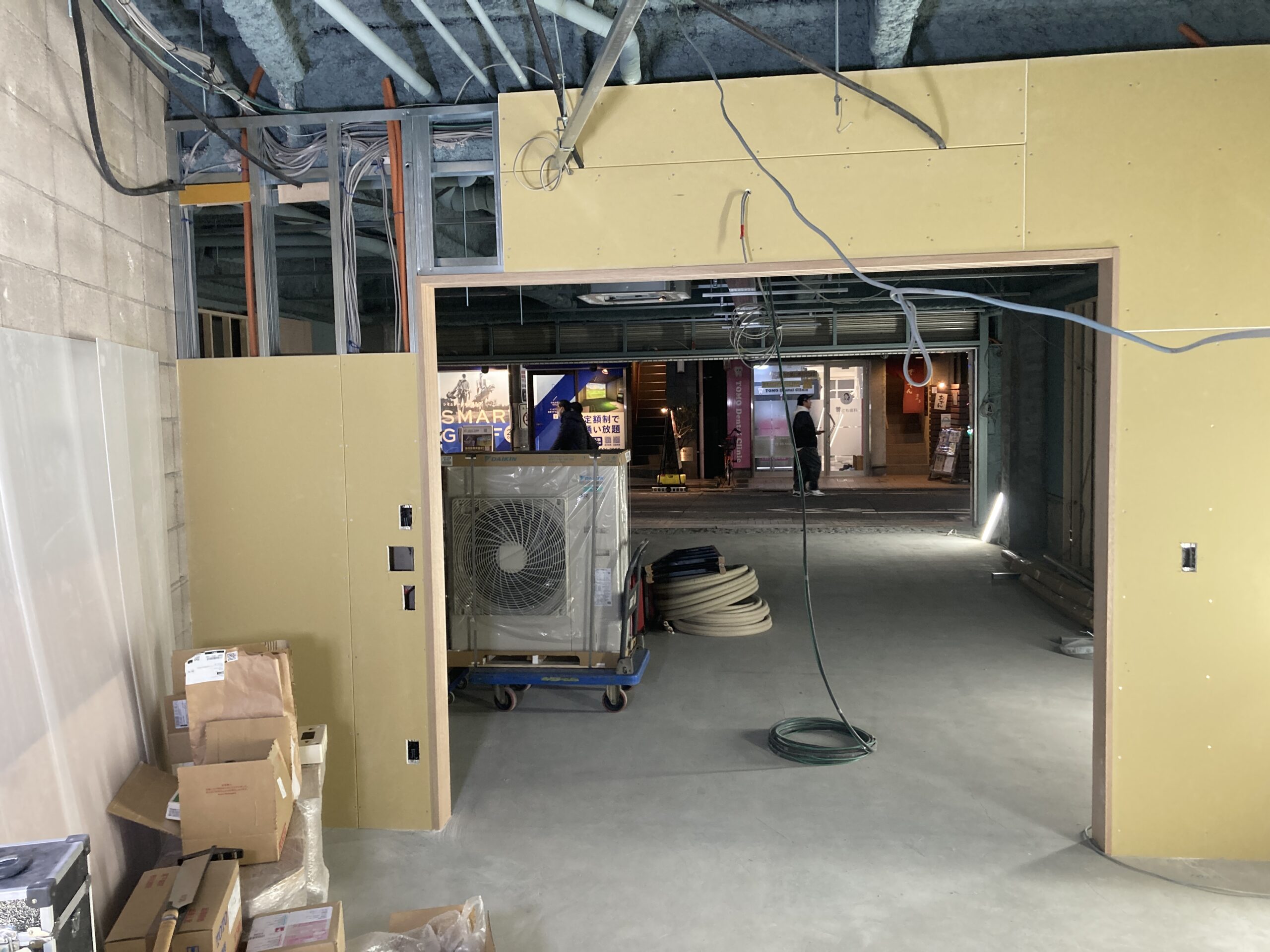 写真の金属部分はLGS(Light Gaze Steel)軽量鉄骨と呼ばれる下地材です。これにPB(Plaster Board)石膏ボードをビス打ちして多くの店舗は構成されます。そのLGS工事とPB工事は同じ職人さんが請け負うことが多いですが、今回はPB工事を翌週にして間を空けています。その間に、建具枠付け、電気配線、給排水の配管、壁・天井の下地入れを行います。