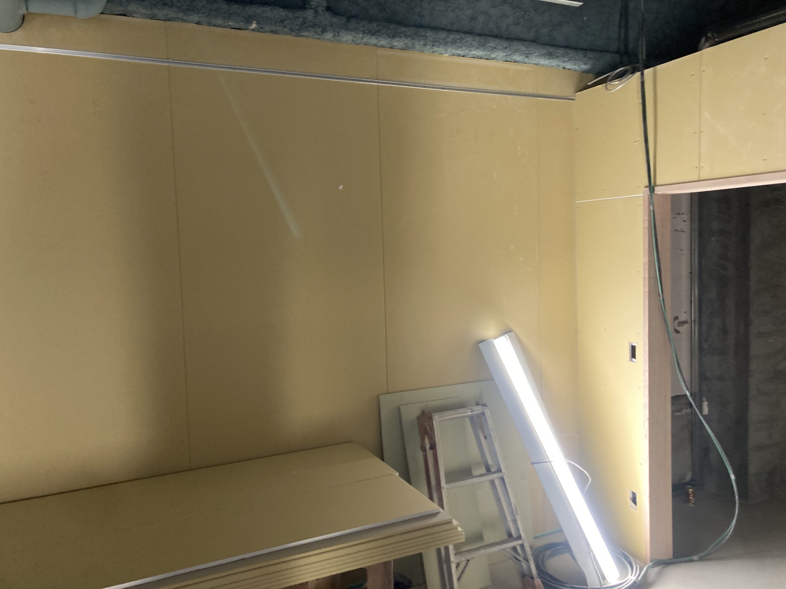 PB張りが終わると、配線・配管・下地は見えなくなり、仕上げを待つことになります。ここまで進むと工事はひと段落です。