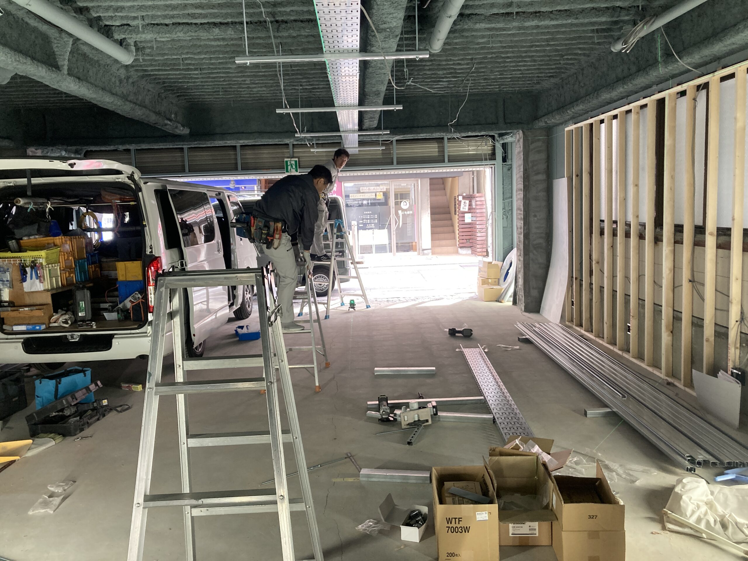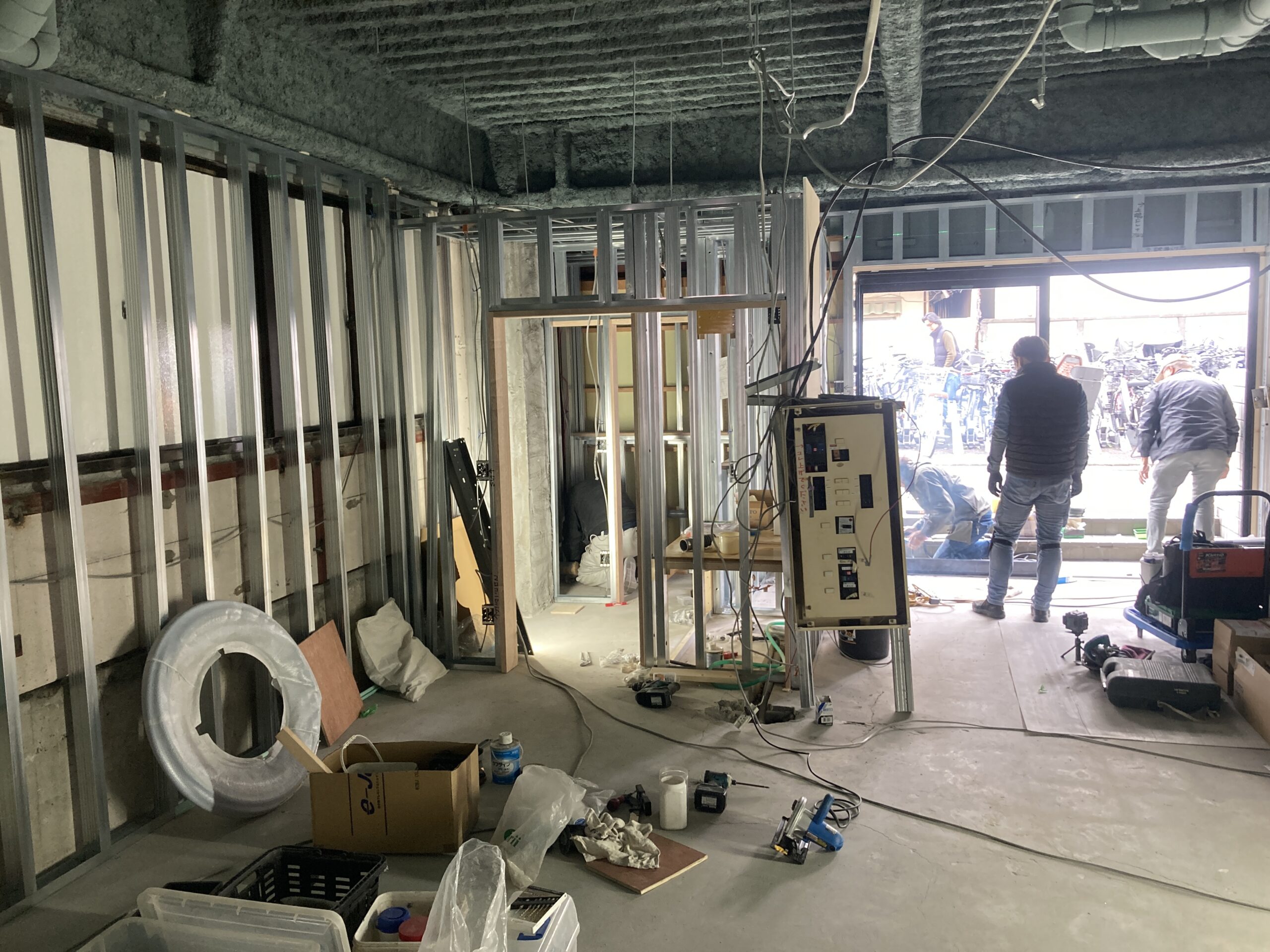 設計施工で請けている経堂の店舗。今日は電気屋さん、サッシ屋さん、水道屋さんが来て立て込んでいます。工程と、もちろん職人さんの予定のあることで、特に工期の短い店舗リフォームではこのような日が数日あります。作業箇所が重ならないように、資材が邪魔をしないように、できるだけ職人さんに作業に集中してもらえるように環境を整えるのが監督としての私の仕事です。